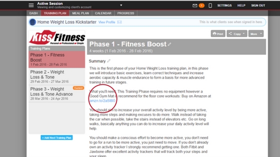 Select products to recommend and add these to your Training Plans, Workout Templates Custom Workout Videos within Trainerize. Any equipment that your client will need, common ones are gym mat, fitness ball etc. Add a required equipment detail to your video, workout template or training plan with a link to Buy from Amazon using the generated link from your Amazon Associate account. This is excellent passive income as the link will be there for all your clients within workout videos. You can recommend specific equipment for the client in their training plan, again with an affiliate link. A personal recommendation from their trainer has very good sway as you are the professional, you know good kit from bad kit, they will respect your recommendation and your chances of a follow up sale are good.