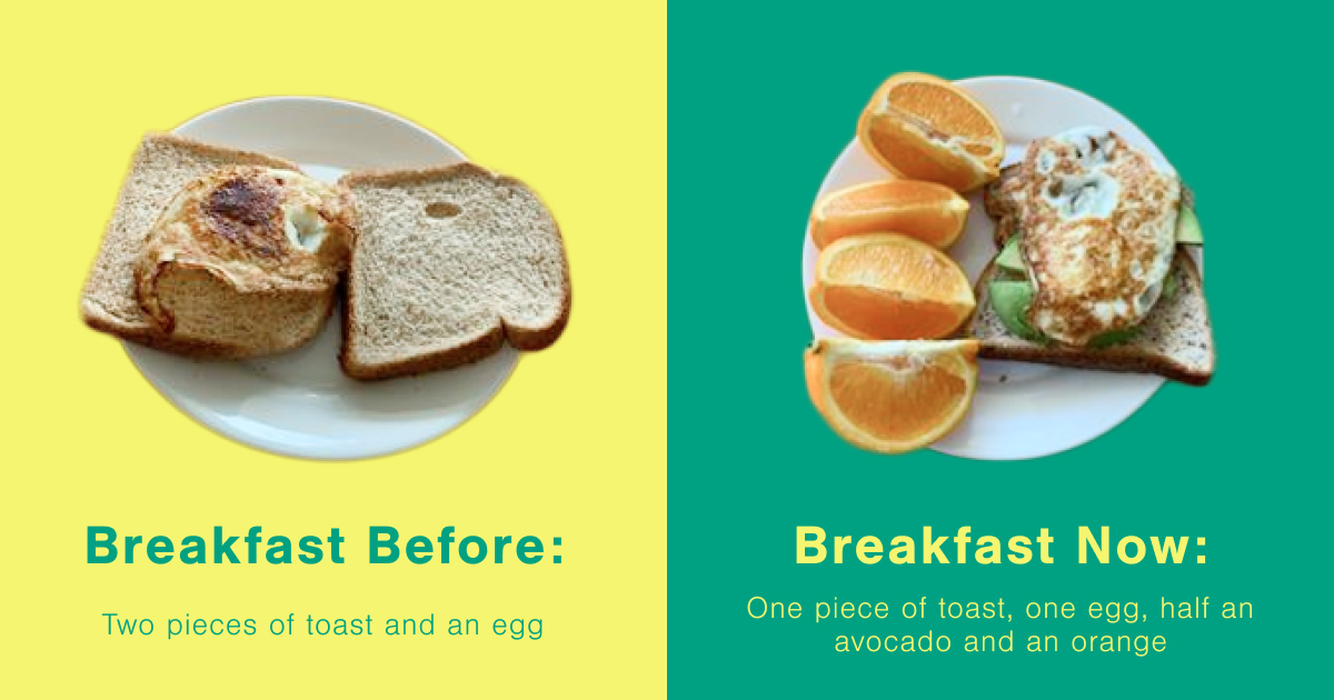 What I told the client: It’s great that you’re eating whole wheat toast, but let’s try to choose better quality bread. Read the nutrition label and make sure sugar isn’t in the top three ingredients! Then, think about adding more color to your plate. Substitute one of the pieces of toast for something else from another food group.