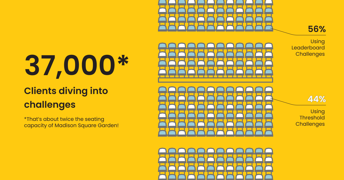 Watch out, weâve got a whopping 37,000 clients (about twice the seating capacity of Madison Square Garden) diving into challenges! Plus, looks like clients are a competitive crew and ready to crush goals with Leaderboard challenges coming out on top.Â