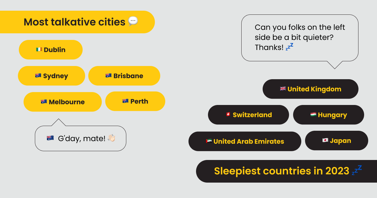 Oi! Australian cities exchanged the most messages in-app. On the contrary, our drowsy friends in the UK, Switzerland, Hungary, the UAE, and Japan had the most sleep-related habits.Â