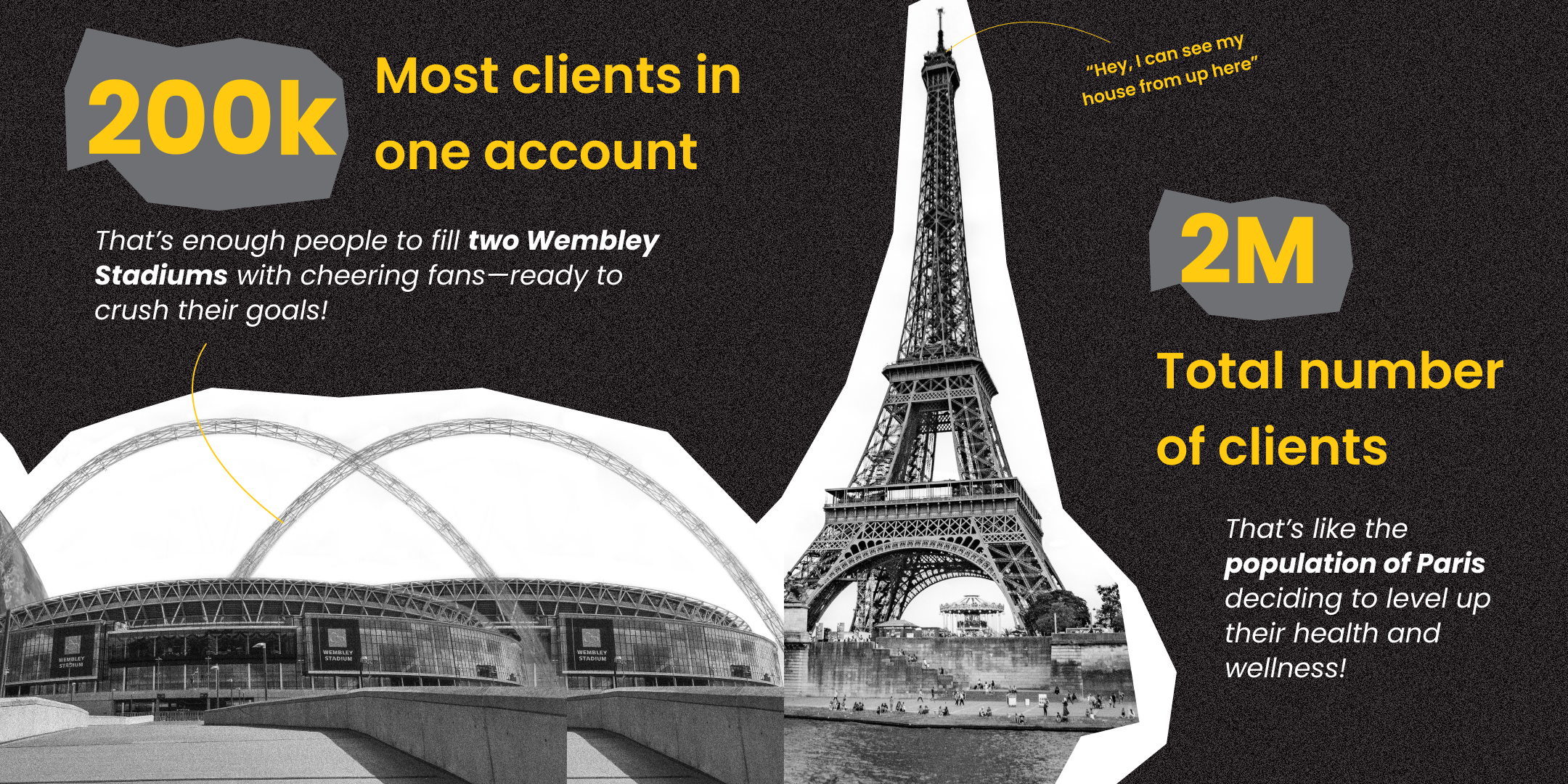 Representing 183 countries, our coaches truly span the globe! The largest account managed a jaw-dropping 200,000 active clients—enough to fill two Wembley stadiums. 2 million clients joined the fitness revolution—think the entire population of Paris going all in on health and fitness.