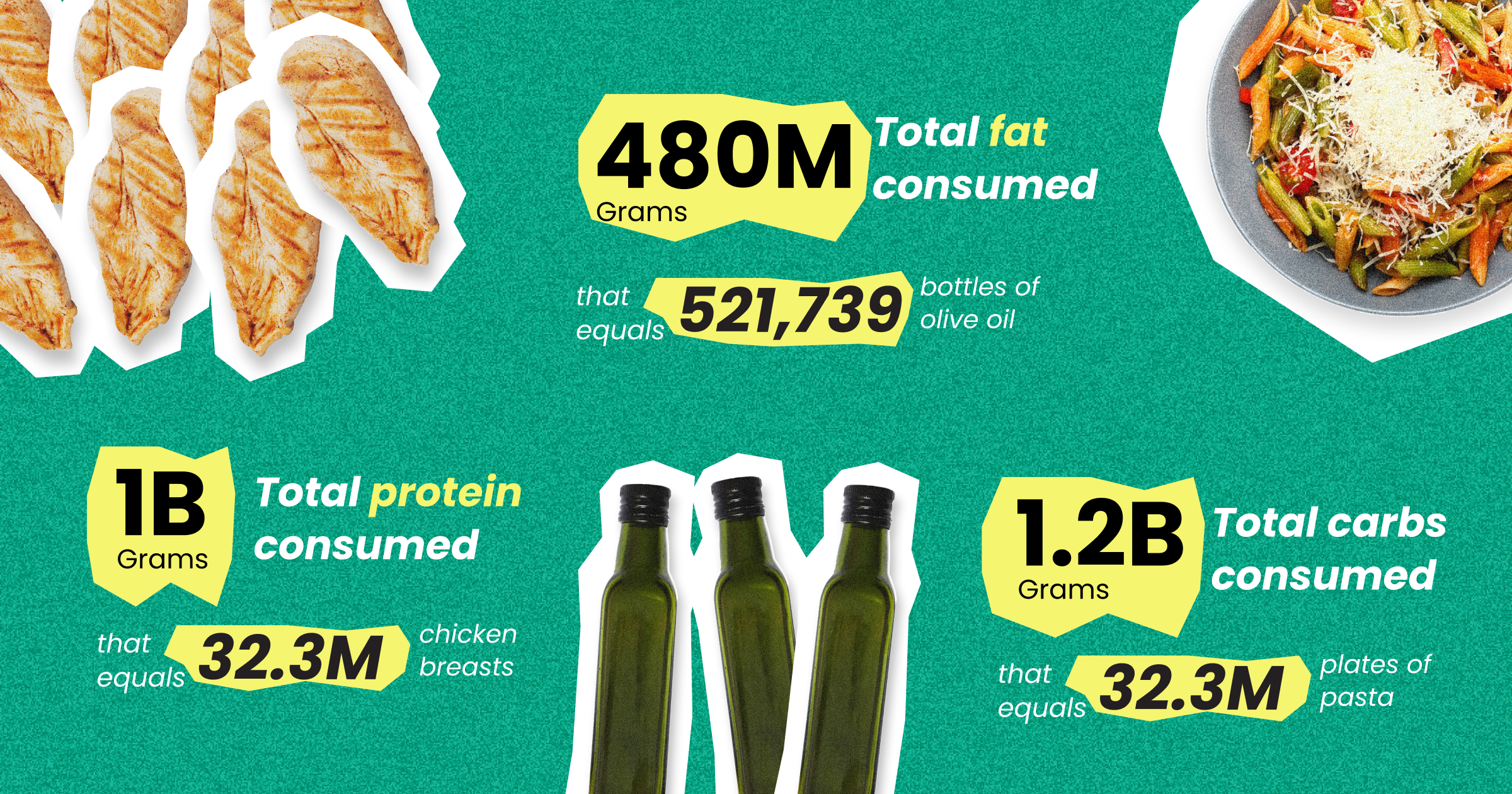 Feeding an army, maybe? Your clients devoured 1 billion grams of protein (the equivalent of 32.3M chicken breasts), 480M grams of fat (hello, 521,739 bottles of olive oil), and 1.2B grams of carbs (we’re talking 24M plates of pasta).