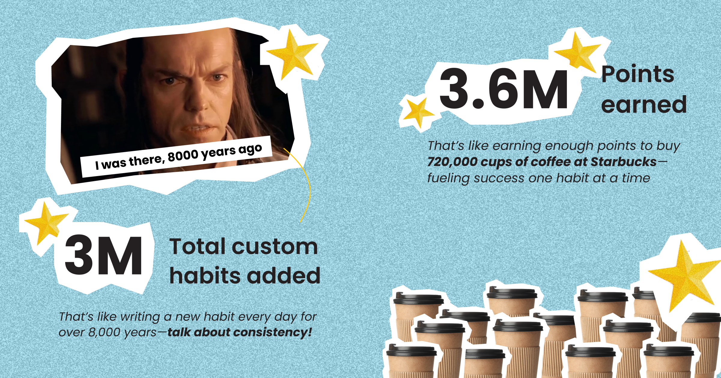 Habits were the real MVP this year, with 37 million completed—that’s like walking around the Earth 921 times if each habit represented a step! Coaches got creative with 3 million custom habits, like inventing one every day for over 8,000 years!