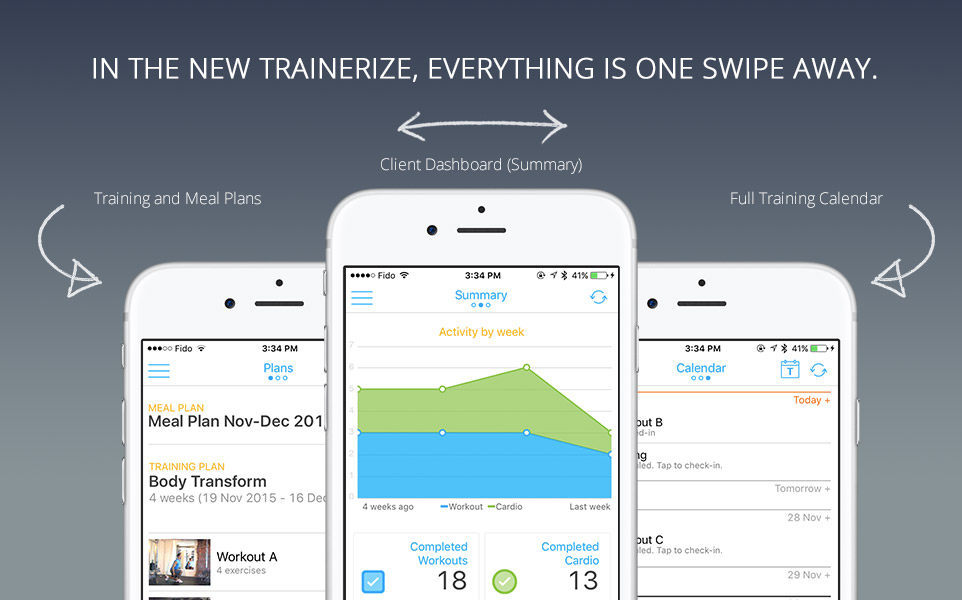 CLIENT DASHBOARD RE-IMAGINED. We’ve completely redesigned the client dashboard into a 3-screen experience. From the Summary screen, trainers and clients can access the calendar and the plans by simply swiping left or right.