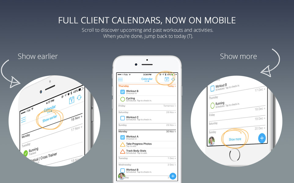 FULL MOBILE CALENDAR VIEW. This is a highly anticipated feature that we’re really excited to announce. Trainers and clients can easily schedule, move or delete items from the calendar. This provides more flexibility when scheduling and tracking workouts for both trainers and clients. Now clients can workout at their own pace and makes changes to the scheduled workouts themselves by logging past workouts or pre-scheduling workouts – clients can plan ahead.