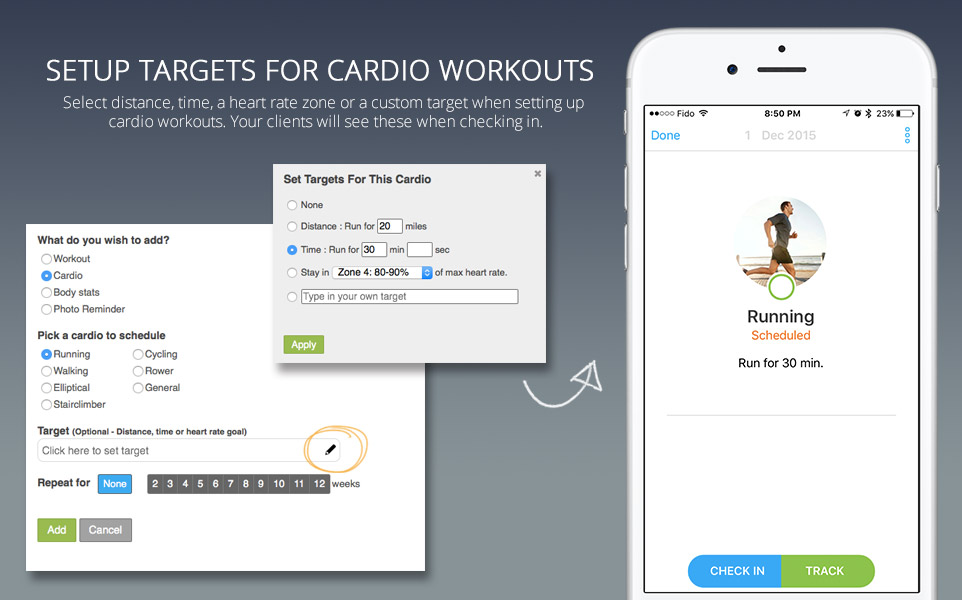 TRACK CARDIO TARGETS. Trainers now have the ability to add cardio targets to all cardio activities. Distance, time and even heart rate zone target setting is now available. For example, whenever a trainer sets a heart rate zone target, the system will automatically figure out the right zones based on client body stats, and set the target according to the suggested zone. Cardio targets are visible to clients when opening a cardio activity and while tracking it.