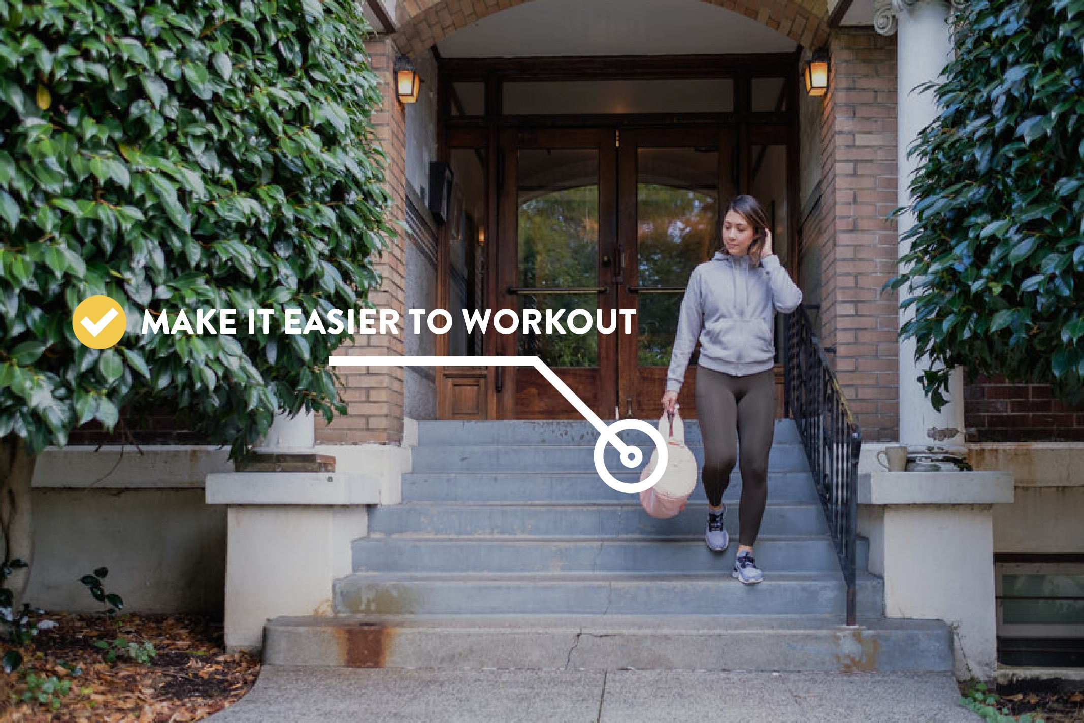 - Encourage clients to make getting to the gym easier by taking steps such as: prepping their gym bag ahead of time, choosing a route that goes past their gym, and leaving gym equipment out in their home to act as a visual cue.