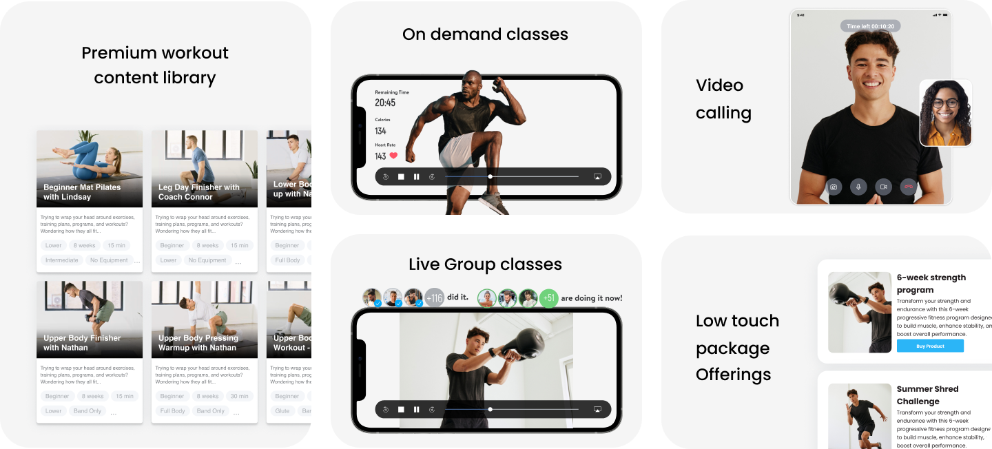 You can build and sell on-demand workout libraries (with your own content or access our premium content library), host live or pre-recorded classes, and use built-in video calling to coach clients 1:1—all from one place. It’s perfect for creating low-touch offerings, adding value to higher-tier packages, or simply reaching more clients without adding more hours to your schedule.