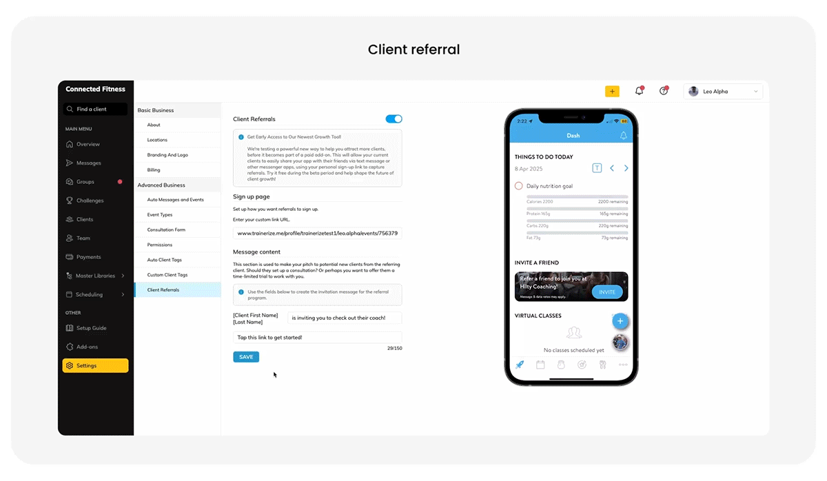 Clients see in-app referral banners prompting them to share your services. You choose where referrals land. Set up custom links that direct people to your prospect booking page, a checkout link, your Trainerize.me profile, or anywhere else you want to guide new leads. It’s simple to set up, totally customizable, and designed to help you grow faster—without lifting a finger.