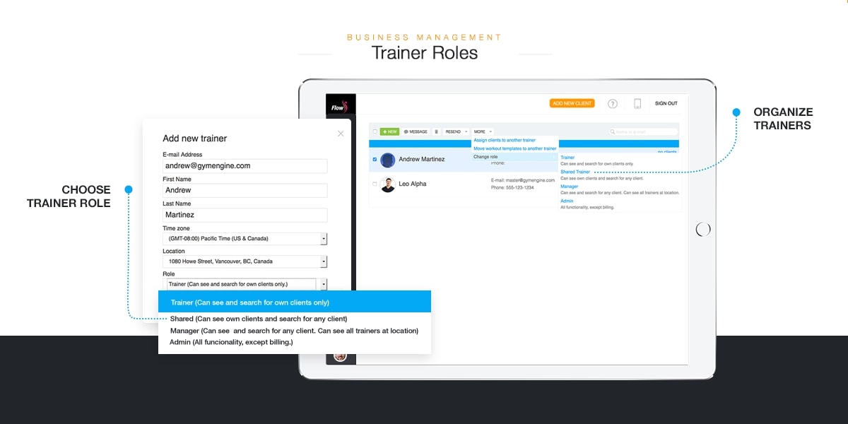 NEW TRAINER ROLES. Gyms and studios don’t just have just one kind of trainer. We’ve made it easier for large accounts with multiple training locations to create different levels of access in Trainerize.