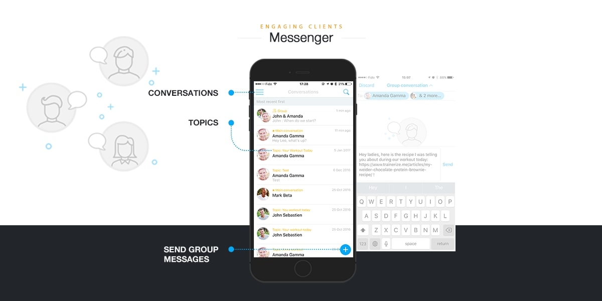 - In addition to 1-on-1 messages, trainers can now streamline their conversations by creating group messages with their clients. Assign a topic to a group conversation to find it more easily in the message inbox.