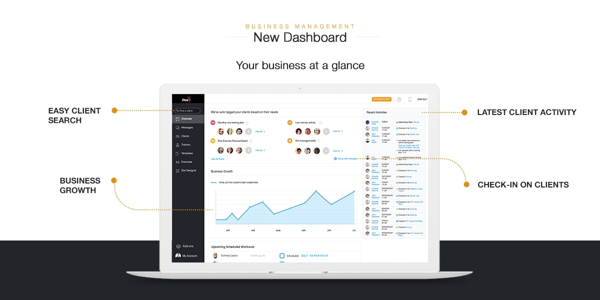 NEW TRAINER DASHBOARD. We’ve added more useful stats for your business by introducing a new trainer dashboard. Now you can see at-a-glance how your clients are doing, and who needs attending to. You will also be able to see your business growth over time.
