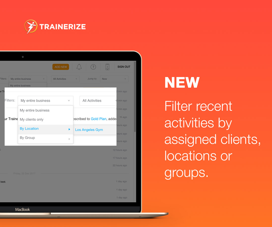Want all the details on all your clients, locations, and business activities? You’ve come to the right place. In the main Trainerize Feed page, you’ll find a full-screen scrollable list of all recent activities. To hone in on specific activities or narrow the list displayed, apply a filter or jump to a specific date.