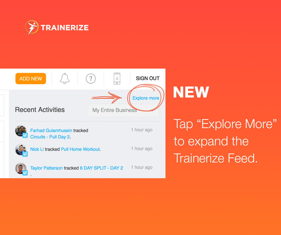On the overview page, as soon as you log into the web app, you’ll see Trainerize Feed in a slim sidebar on the right side of the page. This sidebar can be easily expanded (just click “Explore More”) to access the full-screen view.