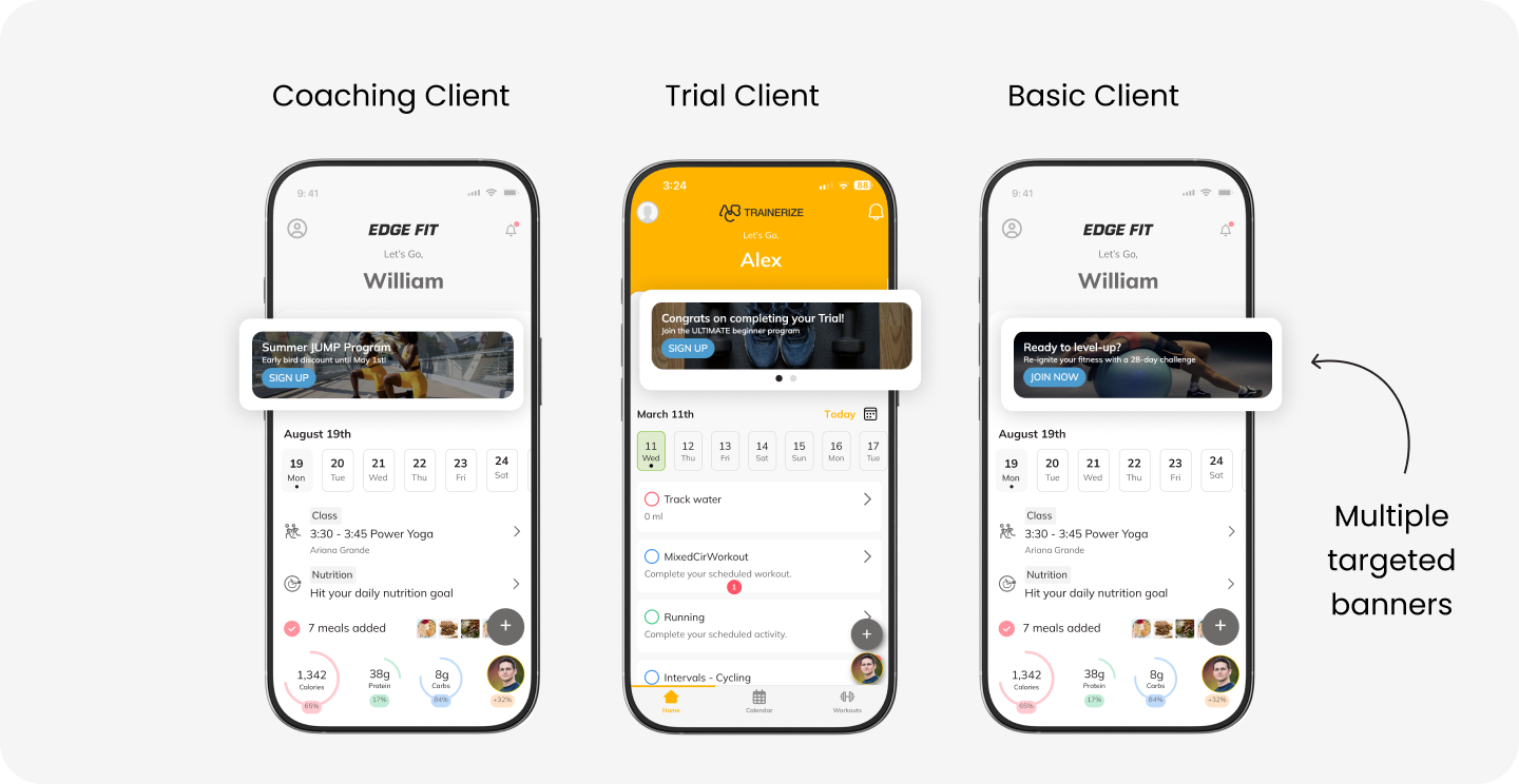 Announcements Enhancements make it easier to promote programs inside the client app. Create multiple targeted banners and notifications for different client groups. You can now also send banners to trial clients to encourage upgrades. Learn more (Available with Business Add-on or on a Studio plan)