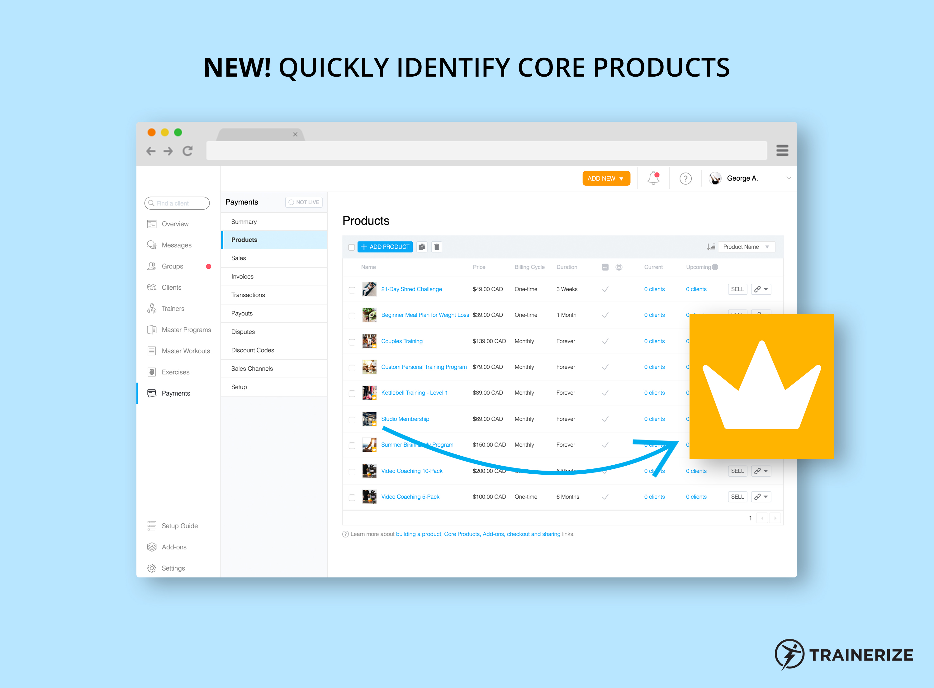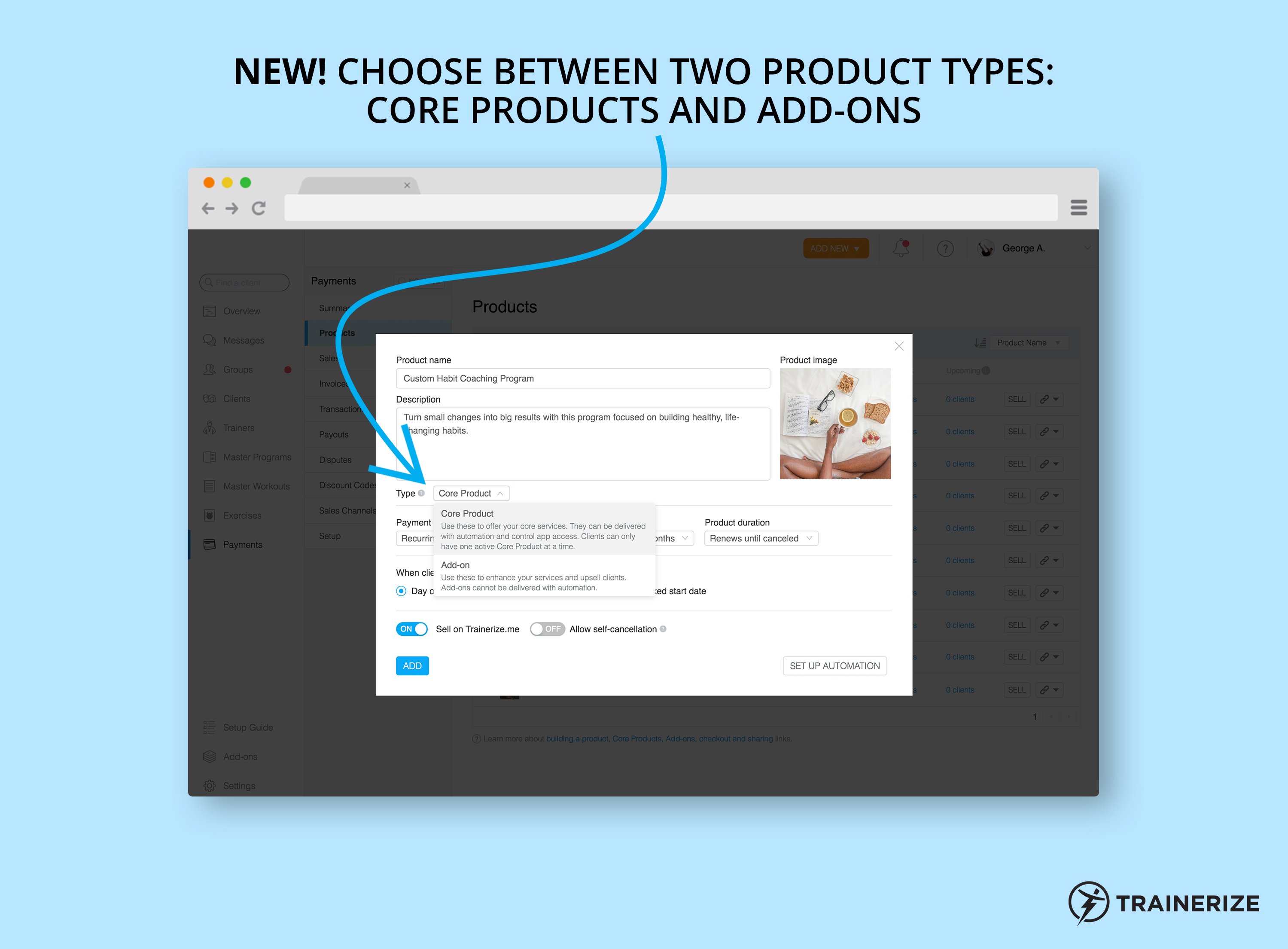 With Trainerize Pay, you can now build 2 different types of products: Core Products and “Add-ons.”