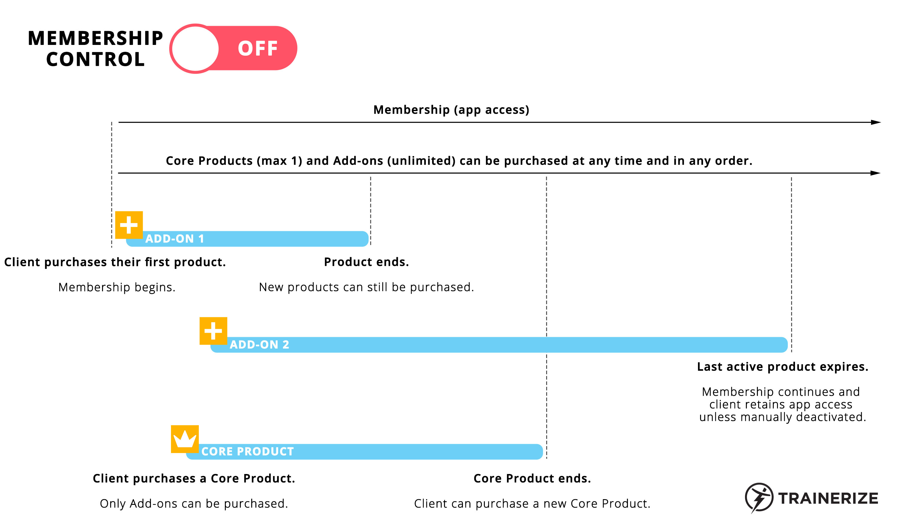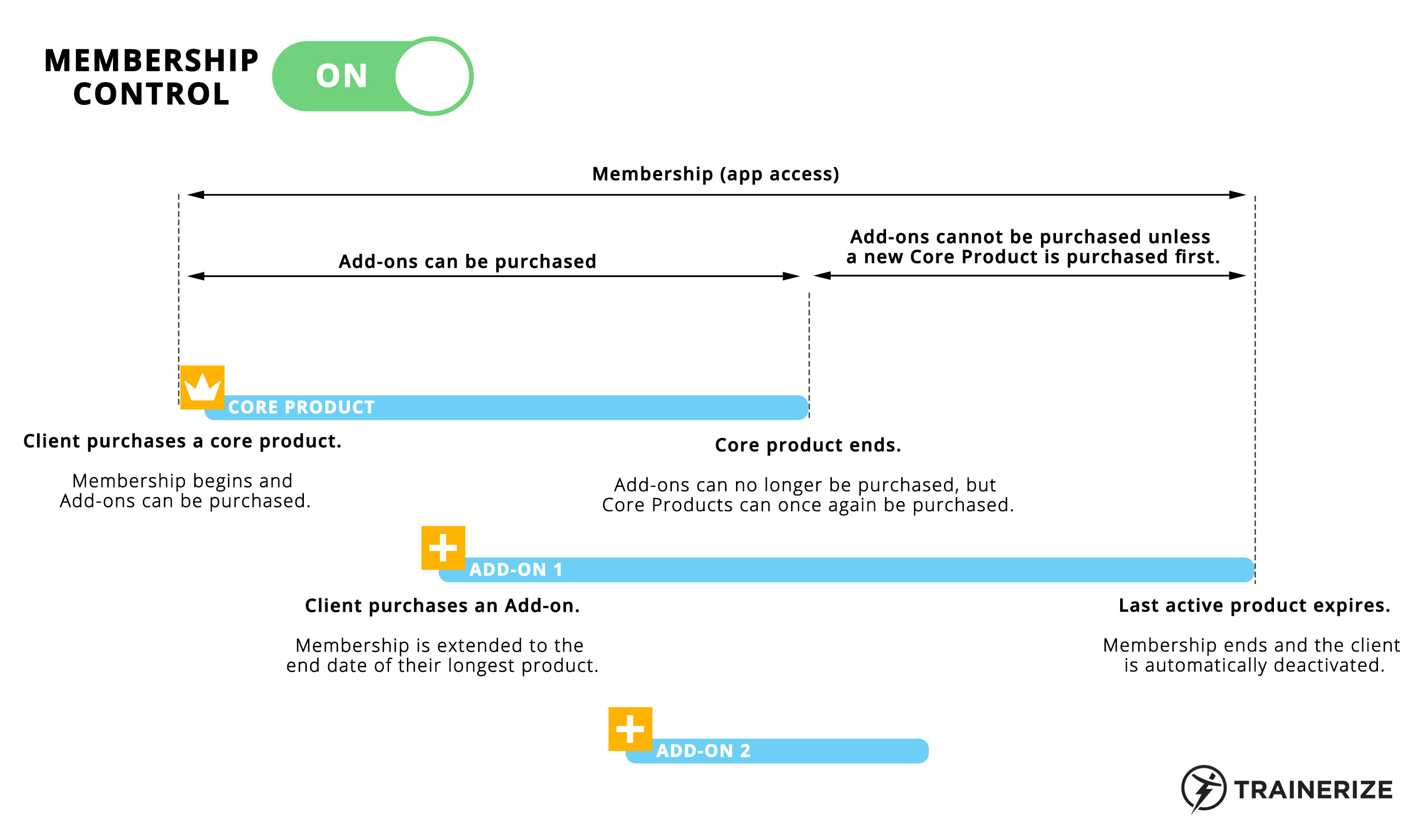 - Clients can purchase Add-ons freely without first needing to purchase a Core Product