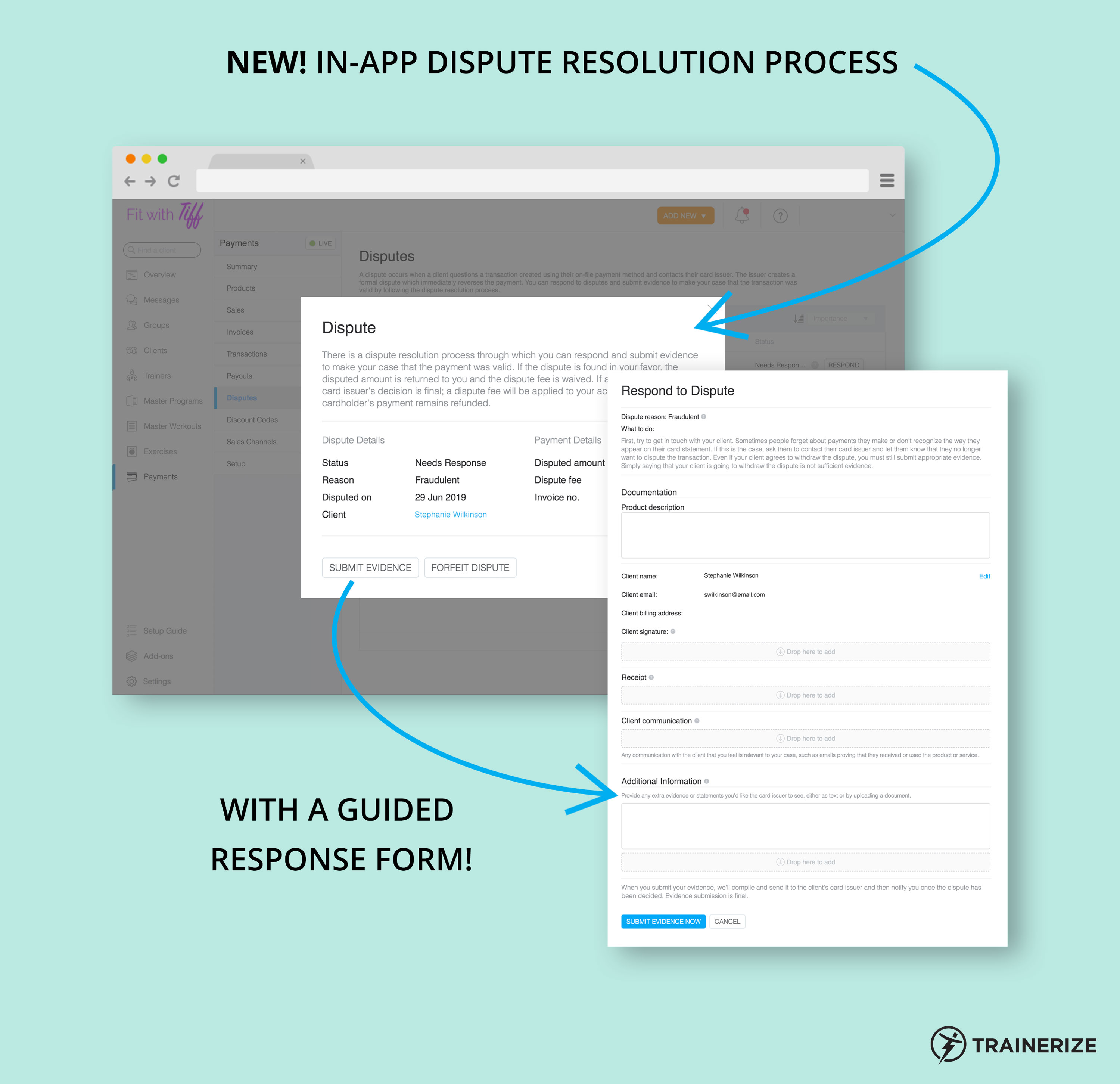 To help you properly respond to and navigate the dispute resolution process, we’ve added a new tab to the Trainerize Pay menu where you’ll find all the relevant information about any open disputes and a step-by-step form for submitting evidence and sending your response.