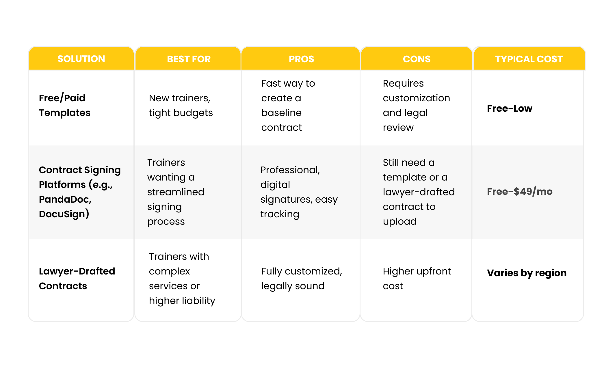 Many trainers already use tools like PandaDoc or DocuSign, or customize Terms and Conditions through in-app payment systems such as Stripe-integrated payments. That’s a great start, but what’s in that contract matters just as much as having one. For full legal protection, a formally signed agreement is always the stronger choice.