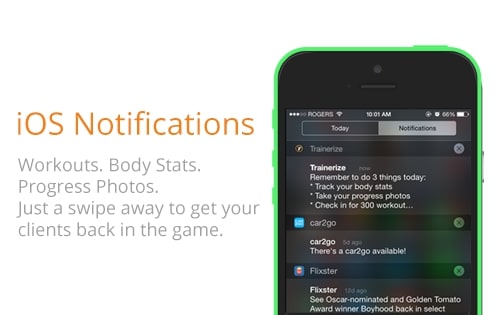 iOS Reminders. Trainerize will now remind clients about what they need to do each day! The notifications show up on the iOS lock screen, so at a glance, your clients can see if they need to workout, add body measurements, or take progress photos. By swiping the reminders, clients open the app and get to re-engage with you and their online workouts instantly.