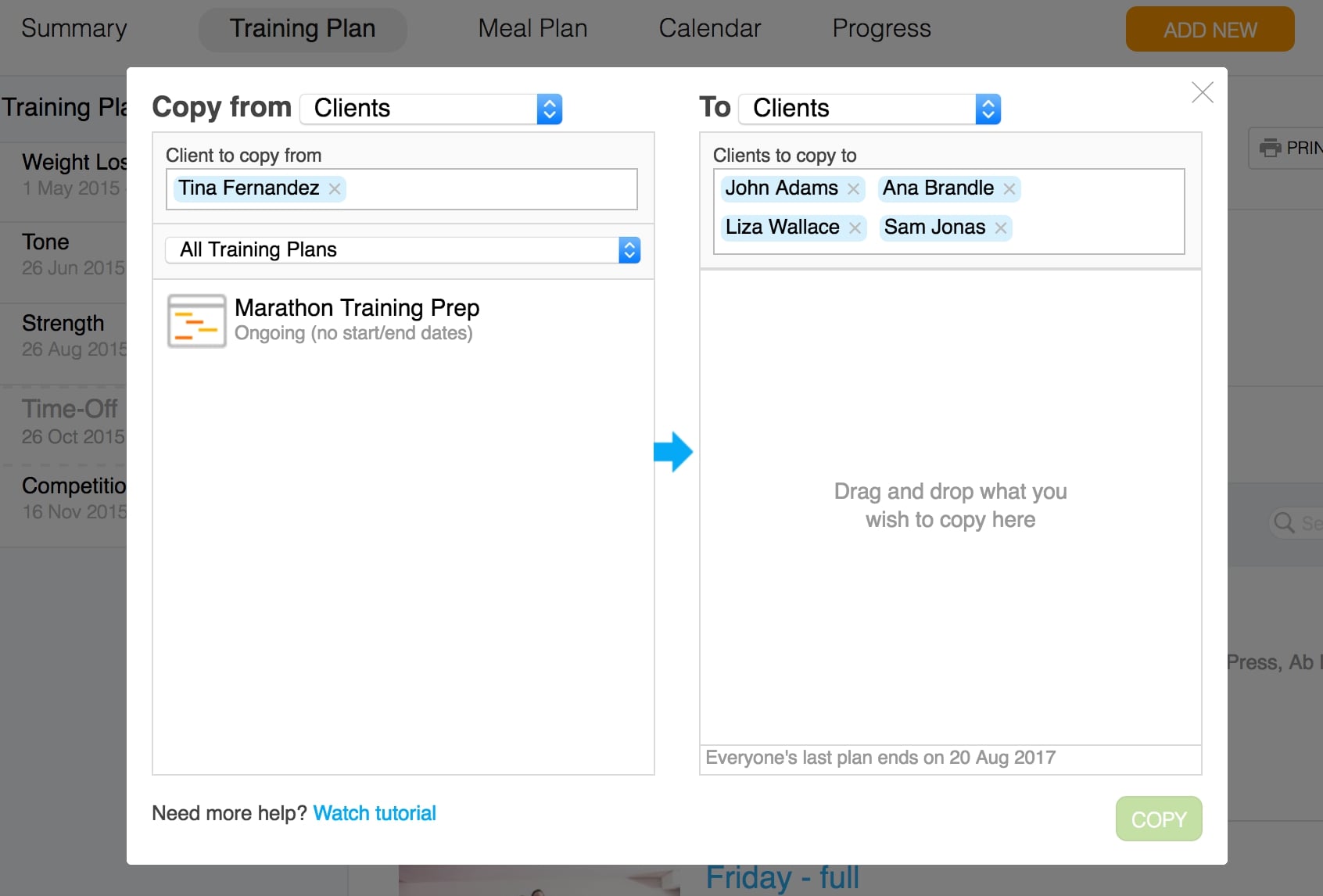 - Next, go into said client’s training plan account, click on the “Training Plan” tab, then click “Copy” and select the “From [client’s name]” option from the drop-down.