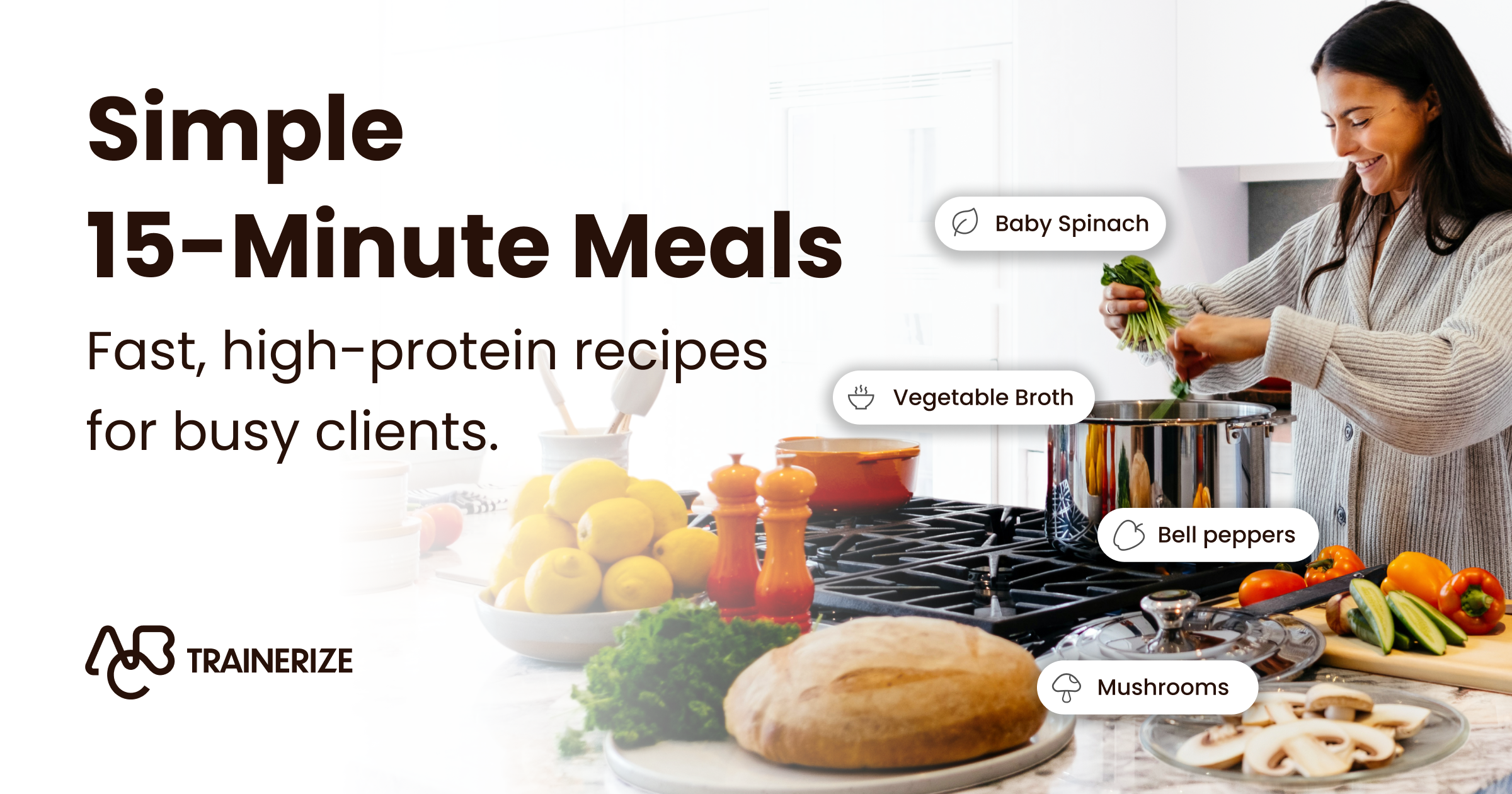 The Simple 15-Minute Meals collection gives coaches practical recipes they can share with clients who need fast, realistic meal options.
