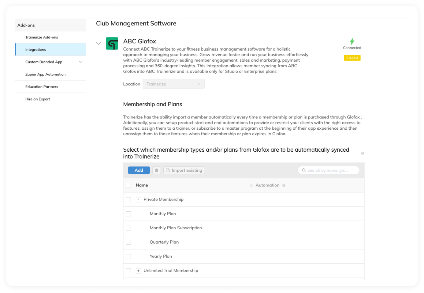 You will need to have a Studio or Enterprise plan with ABC Trainerize and an ABC Glofox plan in order to access the ABC Glofox x ABC Trainerize integration