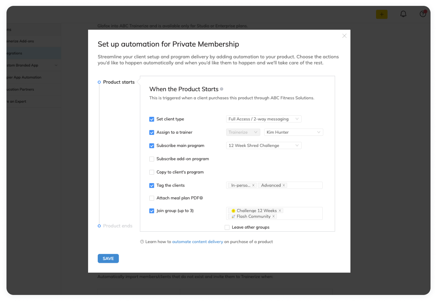 Once your memberships are synced, you can set up product delivery automation so that coaching is delivered seamlessly. This new feature bridges the gap between sign-up and service delivery. When someone purchases a membership or product in ABC Glofox, ABC Trainerize automatically takes over to deliver a complete onboarding experience. Clients can receive assigned training programs, habit coaching, nutrition resources, welcome messages, and even be grouped with other members or connected to a coach—all without any manual input from your staff. It’s a simple, effective way to turn a sale into a meaningful, consistent member journey.
