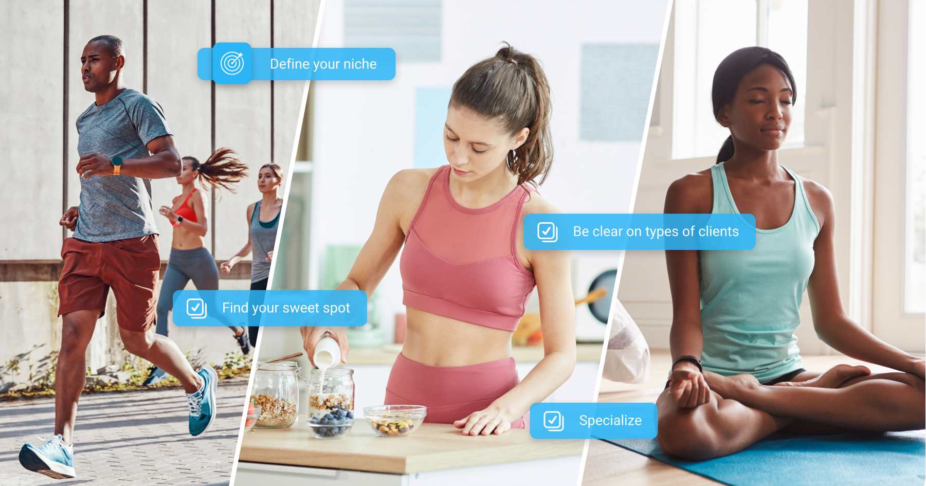 However, defining your niche is made all the more simple once you’ve started to gain experience in working with a variety of people. You may start out thinking you want to help moms lose weight, only to realize you actually love the athletic performance side of things.