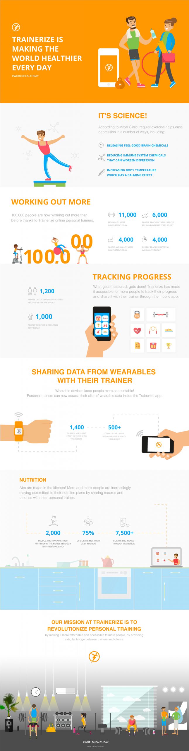 Trainerize wanted to honour World Health Day the best way we know how–with fitness. Check out our infographic below, on how we are changing the world by making it healthier, every single day.