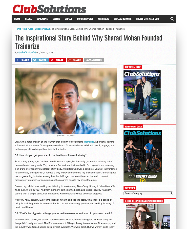 Trainerize CEO, Sharad Mohan had the opportunity to be featured in Club Solutions magazine where he shared the story of how he came to co-found Trainerize and launch an app that’s changing the world of fitness.