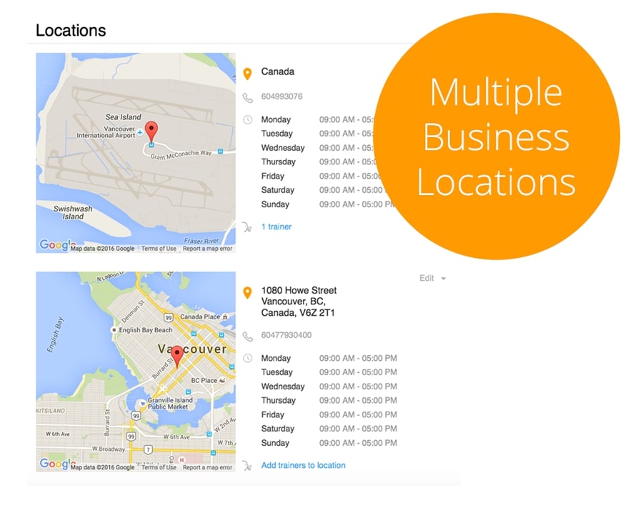 Business administrators on a Studio Plan can now list multiple locations in Trainerize. These will be linked to the Trainerize.me company pages and will showcase contact information, opening hours, as well as trainers assigned to that specific location. Location pages will give business owners a new way to promote their business.