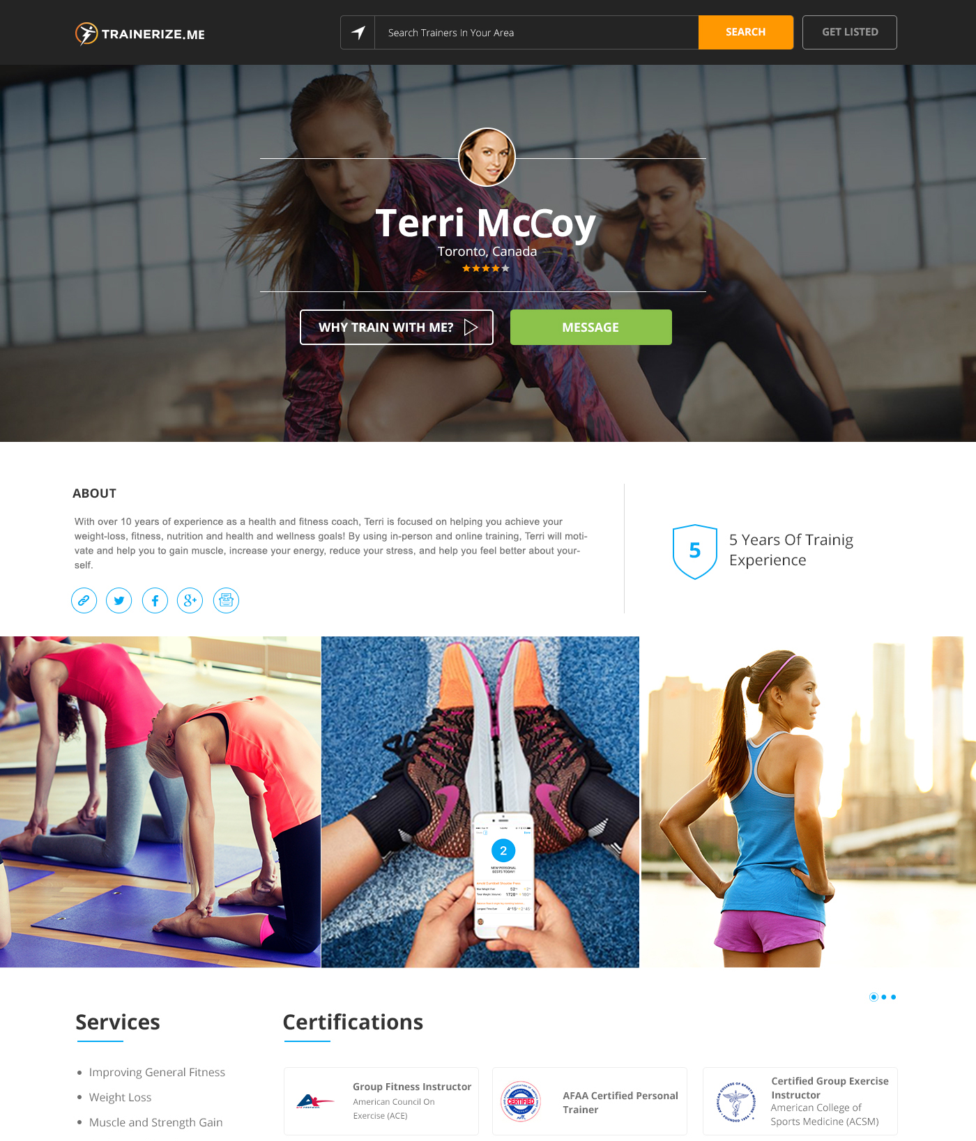 Through a powerful profile matching algorithm and location-based search functionality, visitors reaching Trainerize.me can search for personal trainers in any area, learn about them and connect with them through the messaging feature. This enables trainers to get more business and motivate more people through their beautiful and user-friendly Trainerize.me profiles.