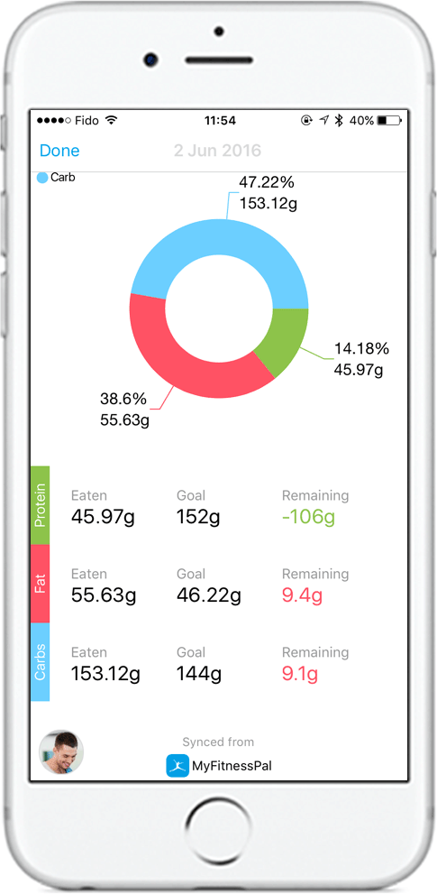 THE NUTRITION MACRO WHEEL. As your clients track their food intake in MyFitnessPal, you’ll be able to see and understand their body composition. Macro statistics such as Protein, Carbs and Fat percentages will show you if your clients are hitting their nutrition goals. Tap on any daily metrics and open up the macro wheel with all the nutritional details for the day. This is a great opportunity to engage with clients who are not drifting away from their set goals by sending them messages at the right time.