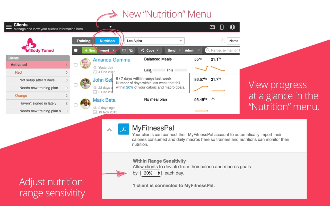 With access to valuable micro and macro level nutrition tracking data, the new MyFitnessPal integration will allow fitness and nutrition professionals to gain a stronger understanding of their clients’ health and provide enhanced nutritional guidance. Both trainers and clients will get access to a brand new nutrition dashboard that is going to make it very easy to see and evaluate their training and nutrition metrics in one platform for the first time.