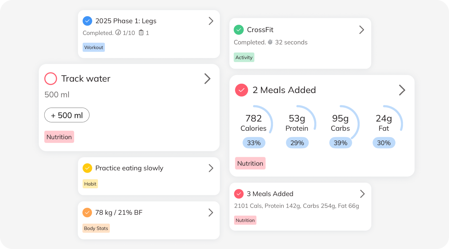 Workouts, habits, and activities now appear together in one streamlined view! This simplified, spaced layout helps clients understand exactly what they need to do today without– distractions or clutter.