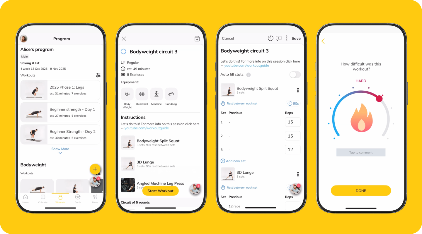 The workout-tracking screen has been refreshed with clean visuals, improved spacing, and clear action buttons to make logging every rep, set, and milestone feel easier and more intuitive. The modernized layout helps clients stay focused during their session, reducing distractions and making the entire tracking experience smoother from start to finish.