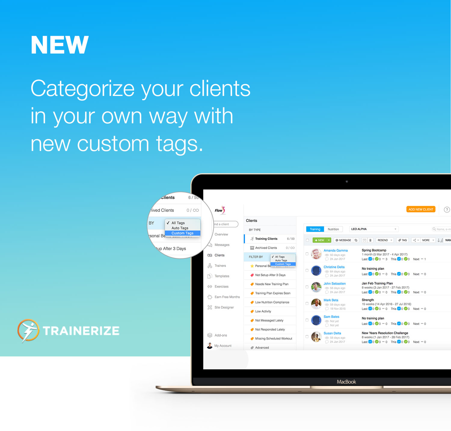 CUSTOM CLIENT TAGS. Custom client tags are finally here! Creating your own client tags will give you more flexibility, better organization and save you lots of time streamlining workouts or messaging similar clients. Client tags work like categories, so trainers can organize their clients the way they want. Previously, the client tags were baked into the Trainerize platform but now trainers have access to creating their own, and organizing their own client system. For example, if you have clients on a 21-day challenge, tag them with “challenge.” Have clients in different cities? Tag them by their locale. Tag them by their skill level, or by their fitness goal–it’s up to you! You can manage your custom tags in the Advanced Business Settings inside Trainerize.
