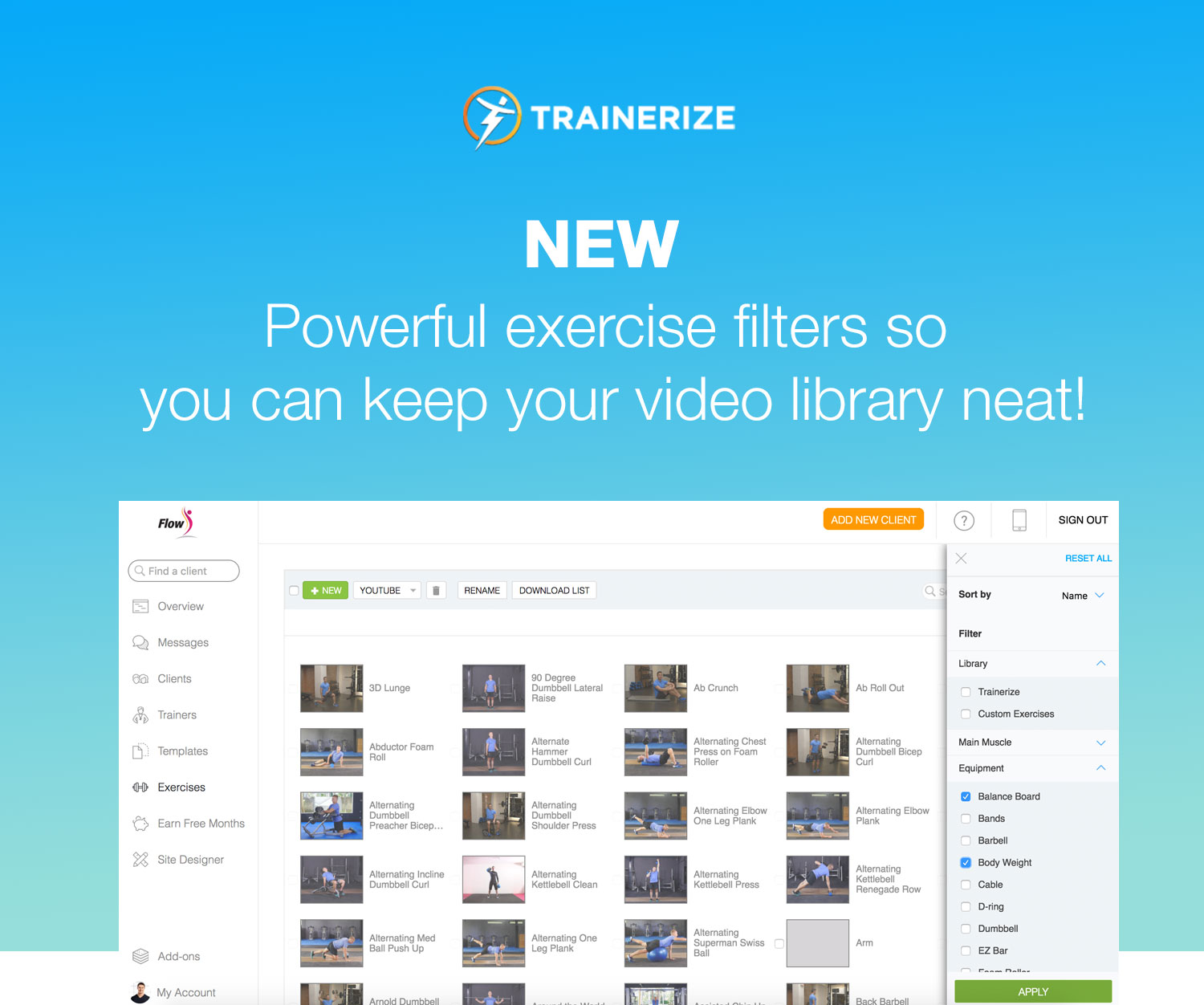 MORE EXERCISE FILTERS. Filters allow you to narrow down search results to find the exercise you’re looking for. After listening to trainer feedback, we realized that we needed more filters to make this process better, and for you to find exercises more quickly. We’ve added several new equipment filters to find exercises.