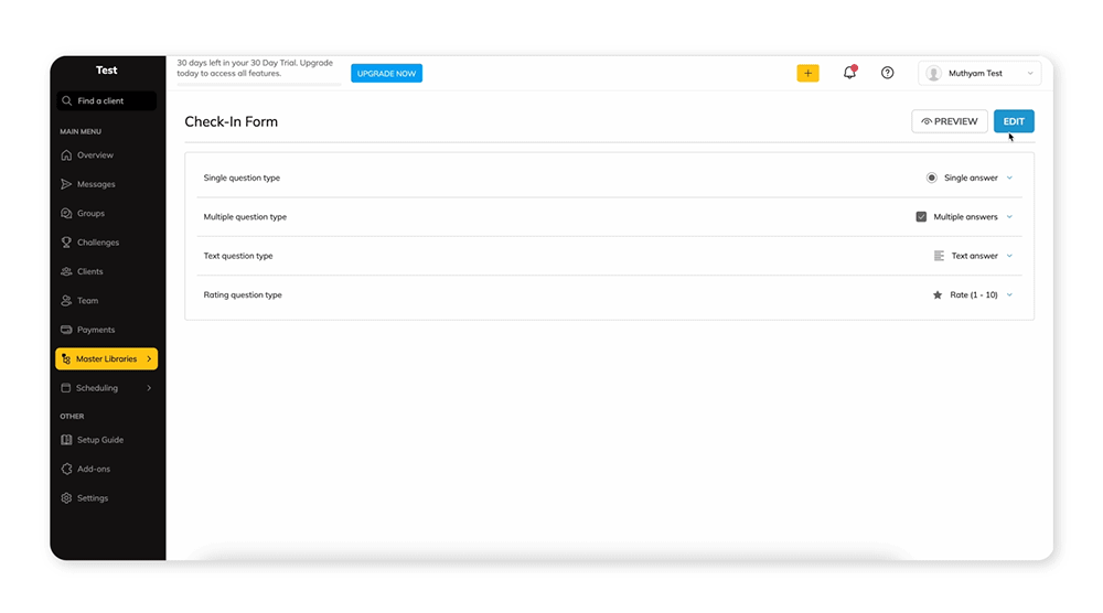- Log in to your ABC Trainerize dashboard, go to Master Libraries > Check-In Forms, and build your first form.