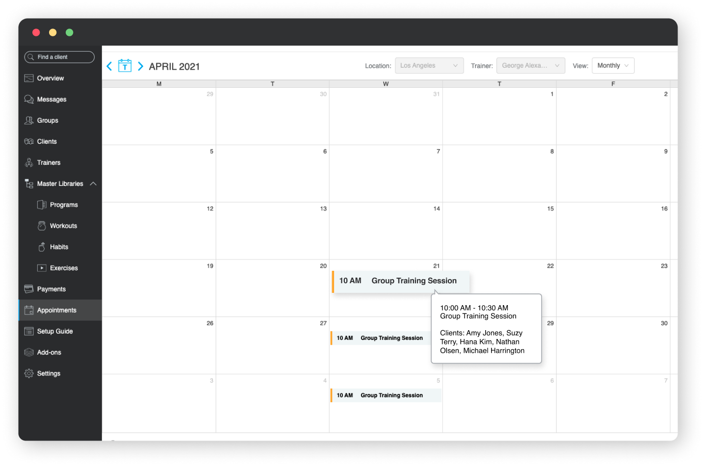 After you’ve scheduled in your group training session, you can easily see details of the appointment. First, by hovering over the appointment in the calendar view. And second, by clicking into the appointment.