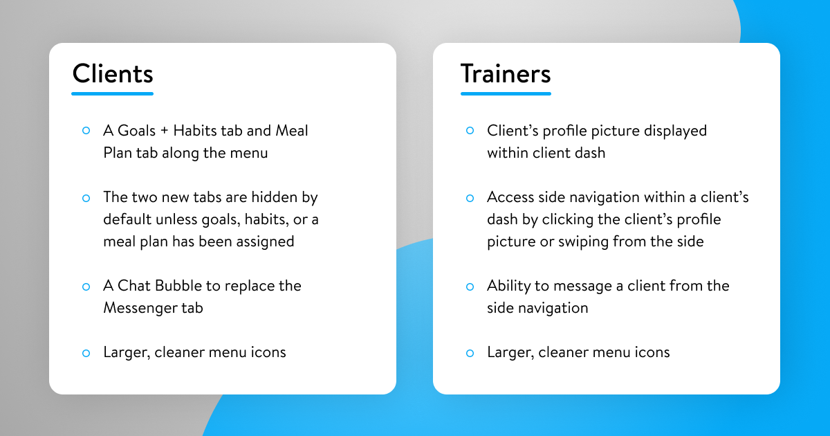 We’ve simplified the way the bottom menu looks for clients. We’ve replaced the messenger tab with not one, but two new tabs they’ll love instead! As a result, we’ve also made some updates to the side navigation menu inside the client’s dash for trainers.
