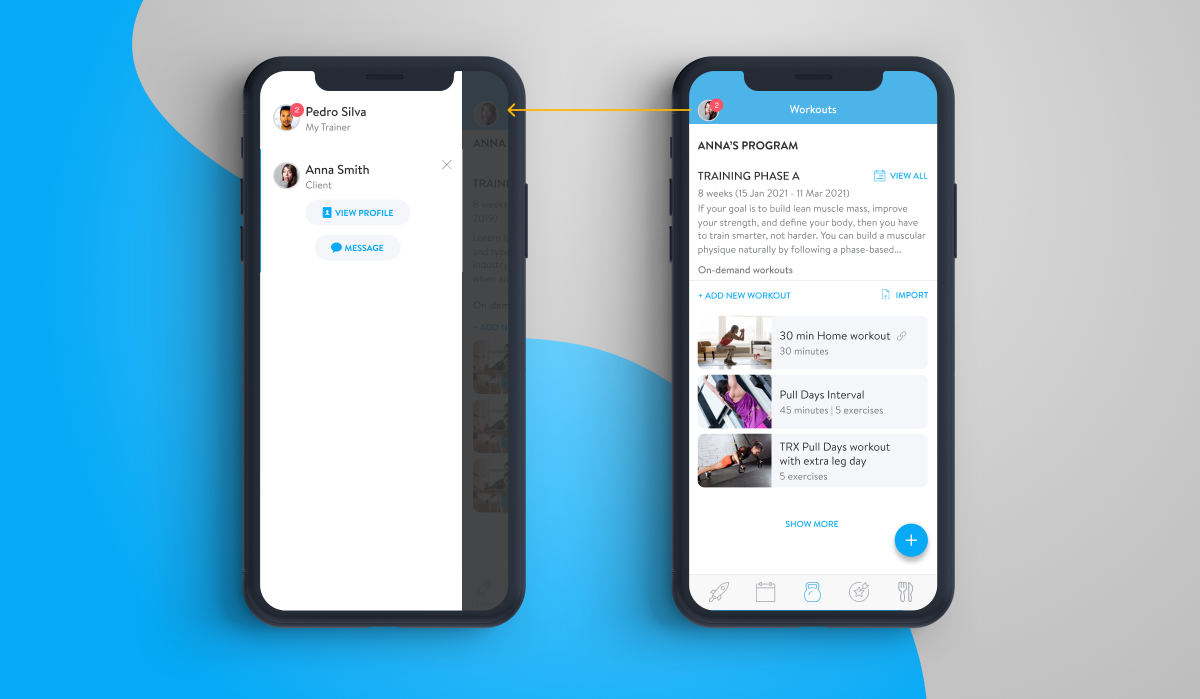 Since we’ve changed the menu for clients, the client dash for trainers naturally reflects those changes as well. To now message a client within the client dash, access the side menu by clicking the profile picture or swiping from the side. Once you’re in the messenger, you can also access other message threads up top.