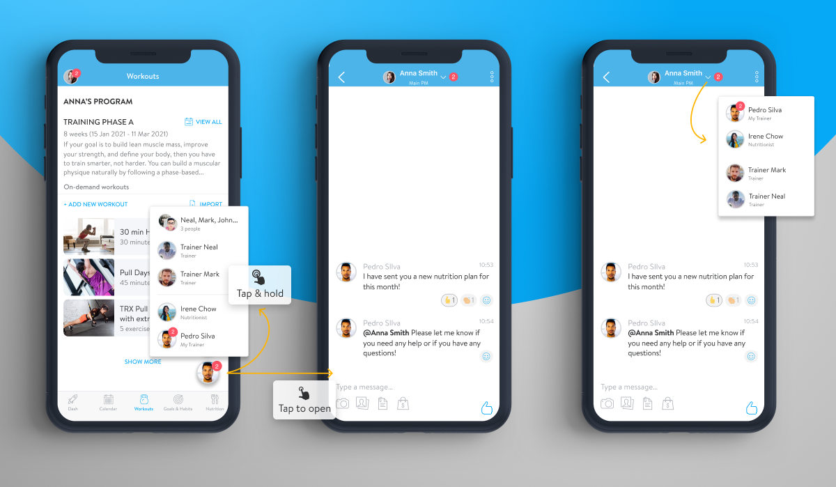 Clients will now see a chat bubble instead to access their message threads. The client’s assigned trainer will be the default chat bubble displayed. Clients can also press and hold the chat bubble to bring up their message threads and click up top to display a dropdown of other messages.