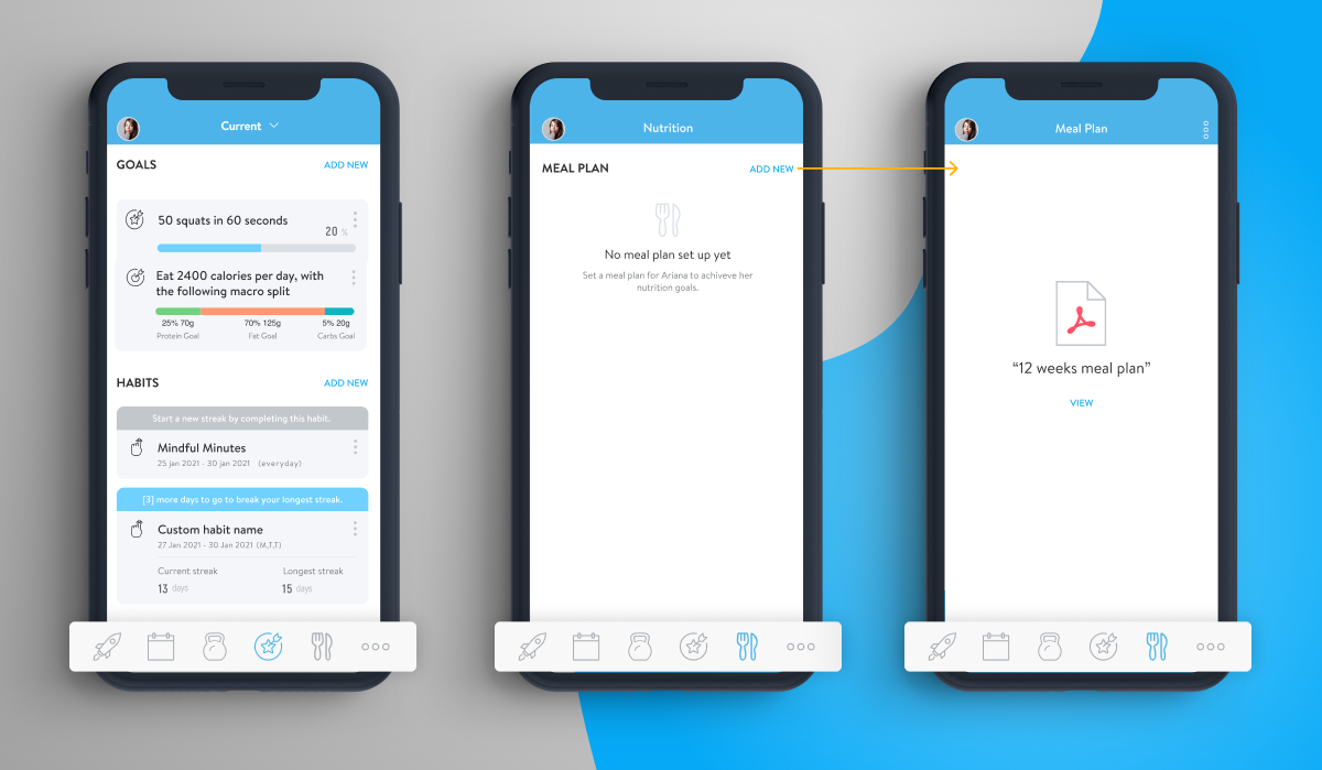 Our Goals + Habits tab will house all of your clients’ goals and habits, including their nutrition goal. While the Meal Plan tab will display their assigned meal plan, plus more nutrition features coming soon, so stay tuned!