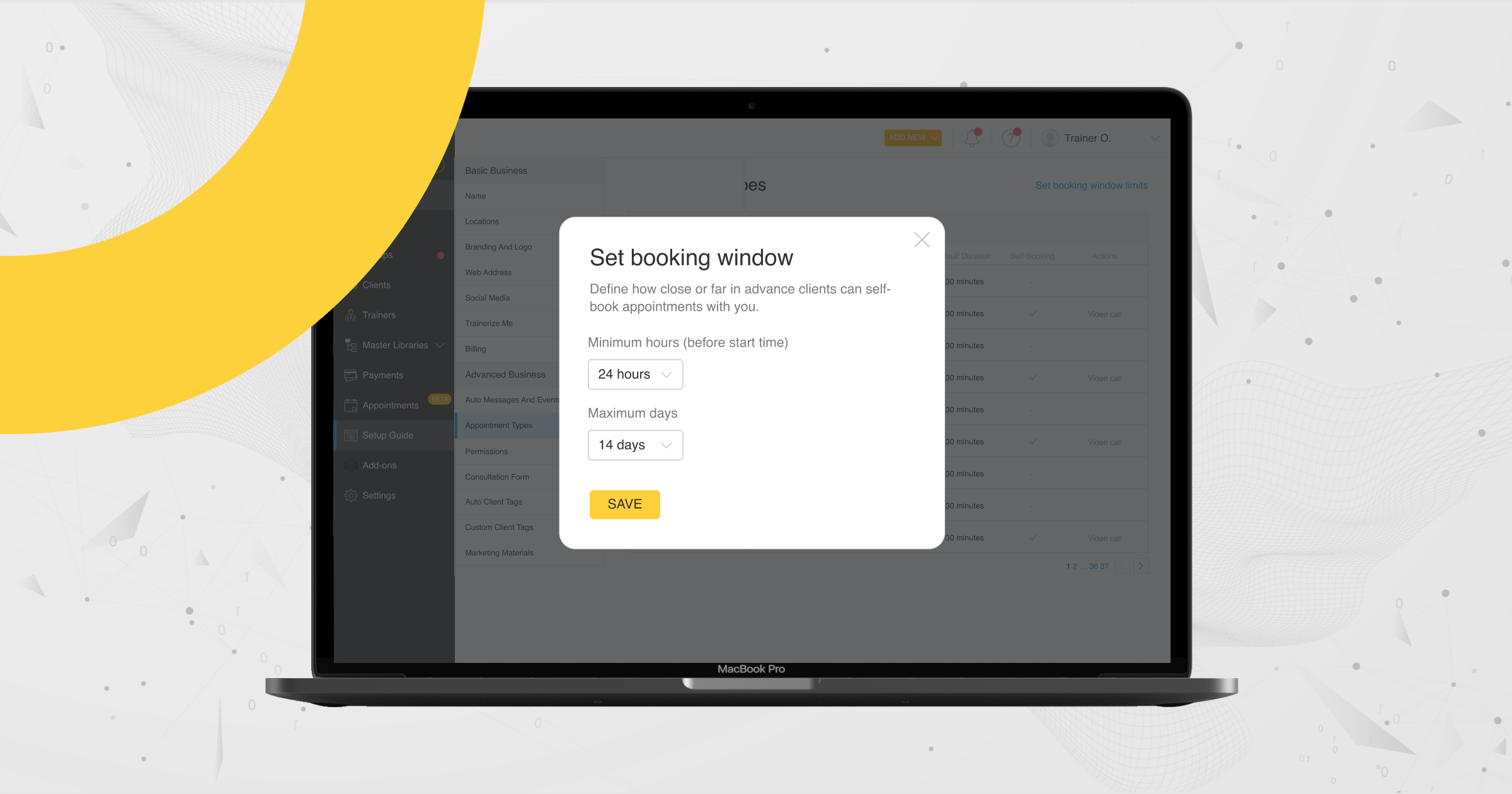 TZ Tip: Control your availability by setting a booking window for all of your appointments. This ensures clients don’t book too late or too far out. This works great when you want to give them a timeline for when they need to finish their PT sessions from a PT session pack. On your Appointment types screen, click “Set booking window limit” and set when clients can view and book appointments.