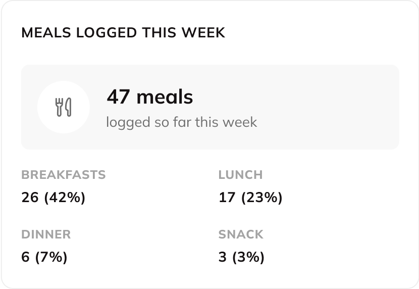 Get a quick overview of how many meals your client has logged and what types of meals they’ve tracked– breakfast, lunch, dinner, and snacks! One of your clients always skips breakfast? Take the opportunity to dig deeper into their routines and structure a nutrition plan that works with them!