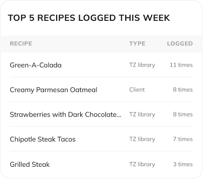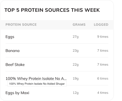 See where your client is getting their gains from: Whether it’s chicken breast, shakes, or plant-based alternatives– this list shows top protein sources, how often they’re logged, and how many grams of protein each one delivered. Great for tapping into client preferences, celebrating wins, and suggesting variety!