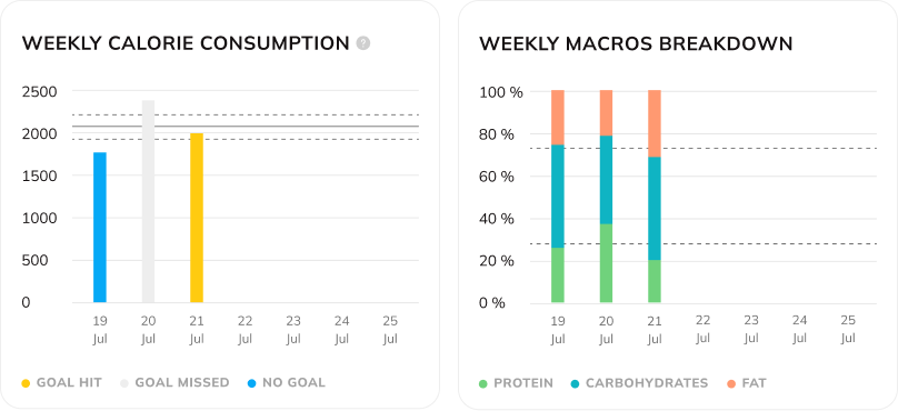 See a weekly snapshot of calorie and macro intake. From calorie consumption, daily breakdown of protein, carbs, and fats it’s a great way to spot patterns–like lower tracking over the weekend and higher consistency throughout the week. Which could help guide your coaching conversations around nutrition.