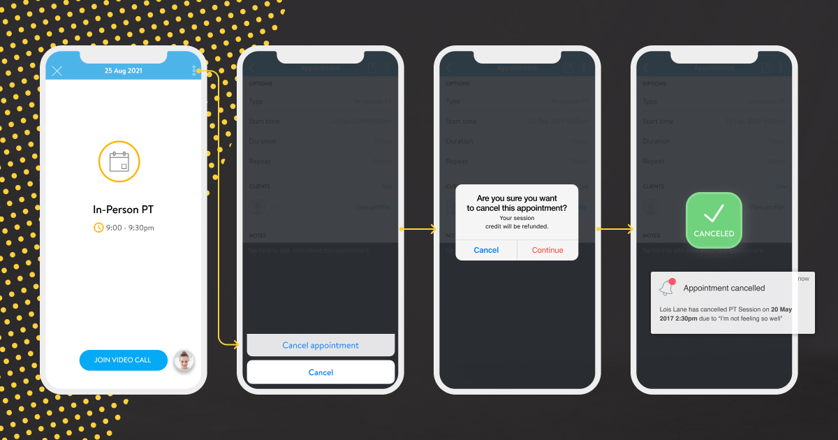 Our lives and schedules can be hectic, and so are your clients! If they find themselves unable to make a session for whatever reason, they can cancel the session right within the app.